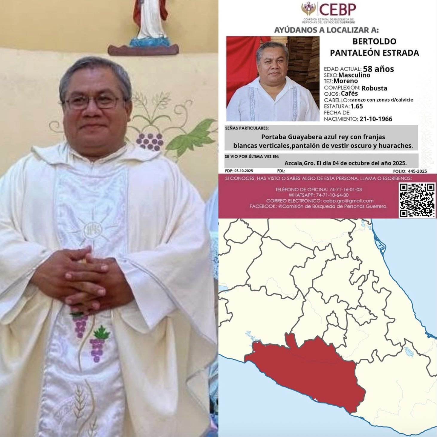 Hallan sin vida al sacerdote Bertoldo Pantaleón en Guerrero; estaba desaparecido desde el sábado