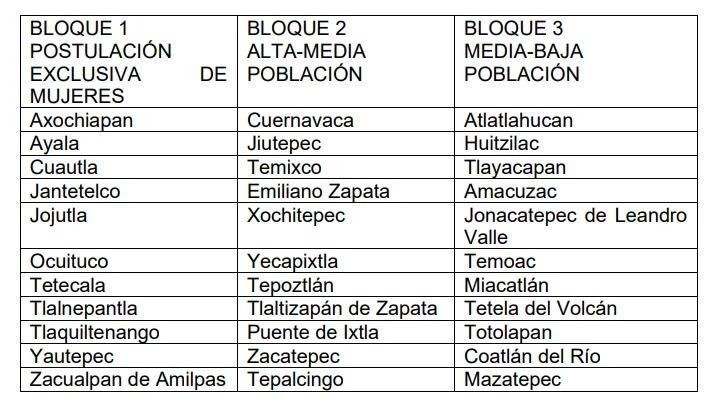 Los municipios donde sólo podrán postularse mujeres son Axochiapan, Ayala, Cuautla, Jantetelco, Jojutla, Ocuituco, Tetecala, Tlalnepantla, Tlaquiltenango, Yautepec y Zacualpan de Amilpas. Con esta resolución, la Corte respaldó el esquema estatal que divide el territorio en bloques para asegurar la paridad sustantiva en las elecciones.